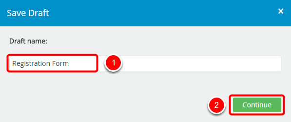 4. In the Save Draft dialog box, type a name for the draft, then click Continue. You can access this form in the Saved Drafts section.