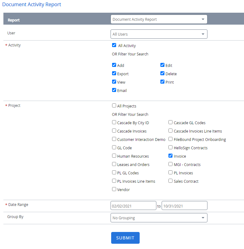 The Document Activity Report shows the type of activity performed by users on documents within a specified date range. This is a project dependent report and displays the activity for the selected project only.