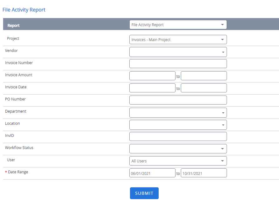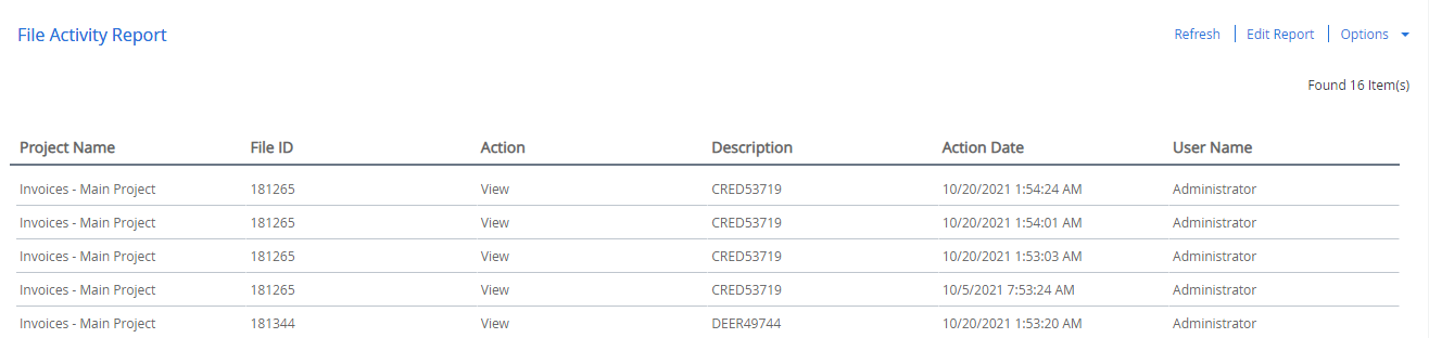 The File Activity Report shows the type of activity performed by users on files within a specified date range. This is a project dependent report and displays the activity for the selected project only.