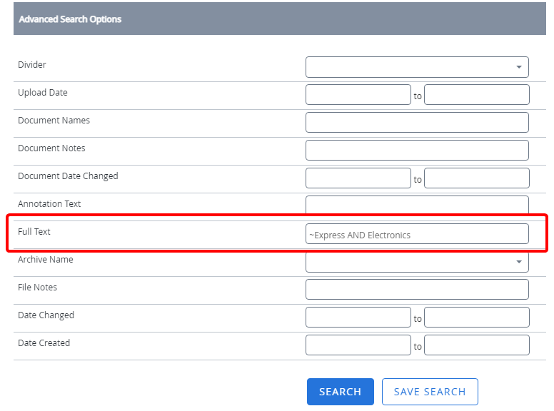 The full text search operation searches the contents of a document as extracted by the Optical Character Recognition (Site-OCR) automation process. The text is displayed in the Document Full Text panel in the viewers. You can manually enter full text search syntax or let FileBound populate it automatically with the use of the Full Text Search String Builder .