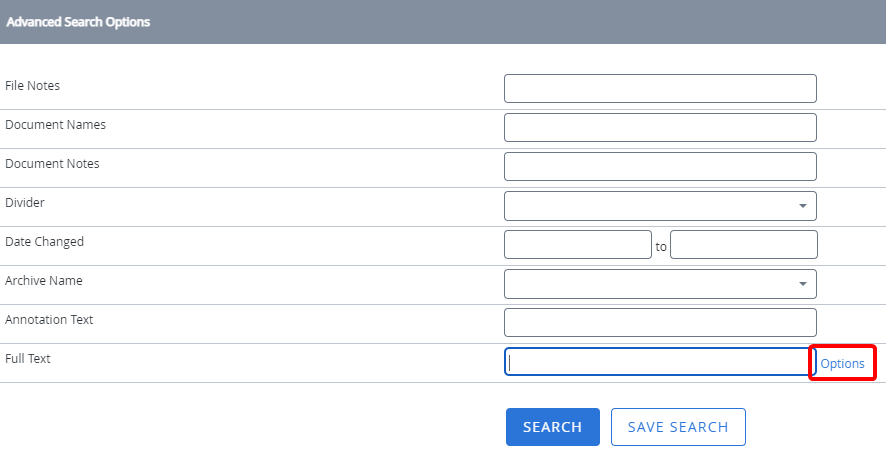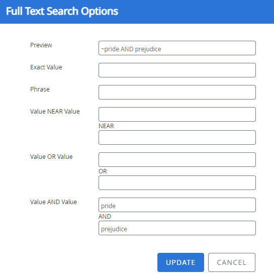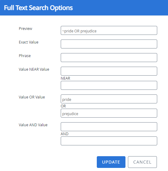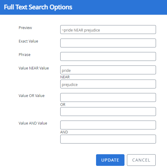 - Enter search criteria in the Full Text Search Options dialog box, then click Update.