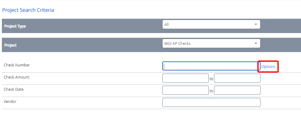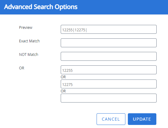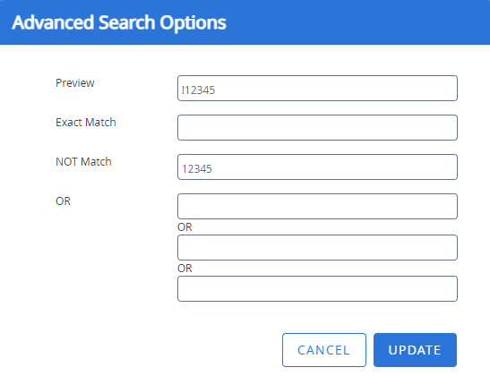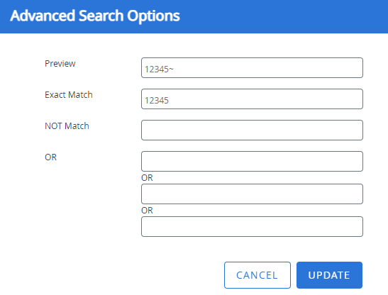 - Enter search criteria in the Advanced Search Options dialog box, then click Update.