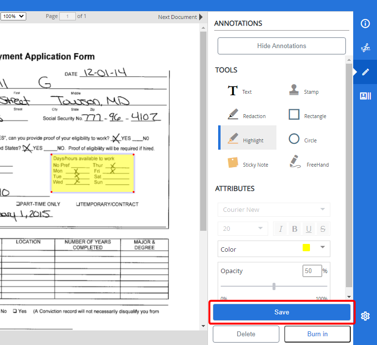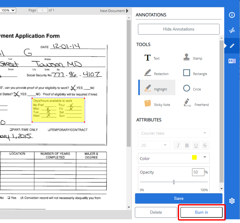 You can make one or more annotations permanent by burning the annotations into the document or image. When you burn in an annotation, the annotation layer is merged with the layer of the document or image, therefore creating a new image. If revisions are not enabled for the project, the original document will be replaced with the new document that includes the burned-in annotation. If revisions are enabled for the project, a new revision will be created that includes a copy of the original document and the applied annotation.