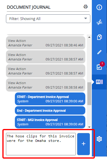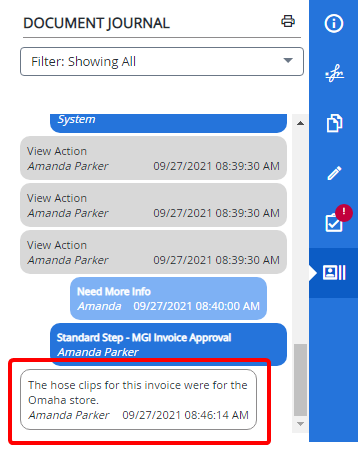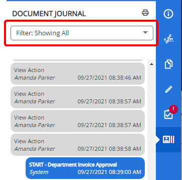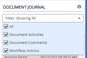 A filter can be applied to the Document Journal so you only see the information necessary. By default, the Document Journal filter is set to Showing Document Comments, Workflow Actions.