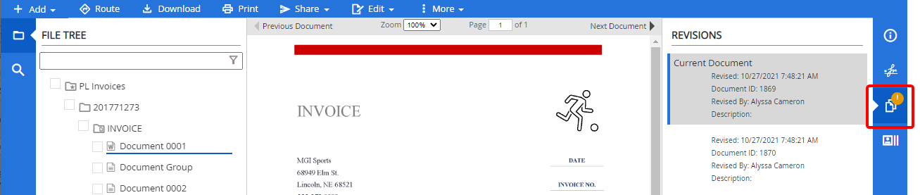 A blue exclamation point is displayed next to the Revisions button when there are revisions for a document.