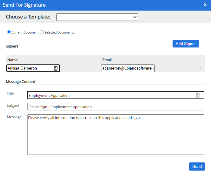 In the Send For Signature dialog box, select an option from the Choose a Template list. The following options are available:
