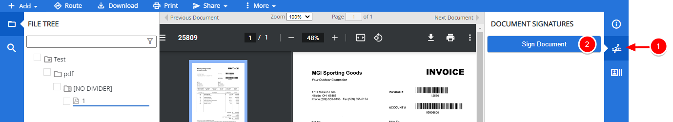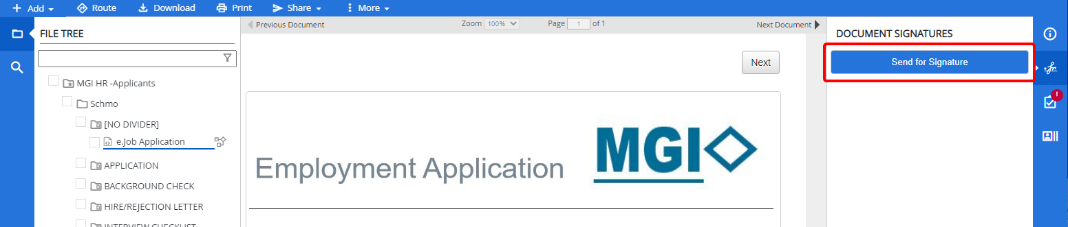 To send a single document for signature, open the document in the Web Viewer OR to send multiple documents for signature, select the check box next to the documents in the File Tree.
