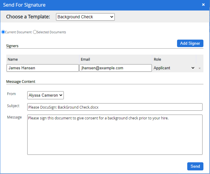 Click Send once all necessary fields have been added to the document.