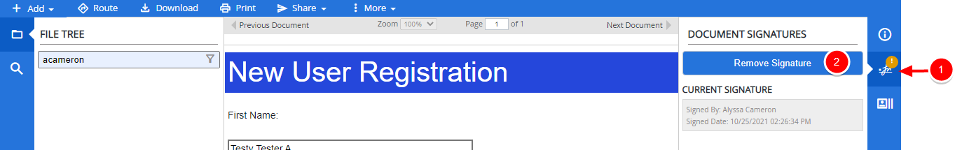 You can add a signature to a document to mark the document as authorized and therefore not editable by any user until the signature is removed. A document signature is an electronic signature that a user applies by entering their FileBound password.