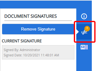 A yellow exclamation point is displayed next to the Signatures button when there is a signature on a document.