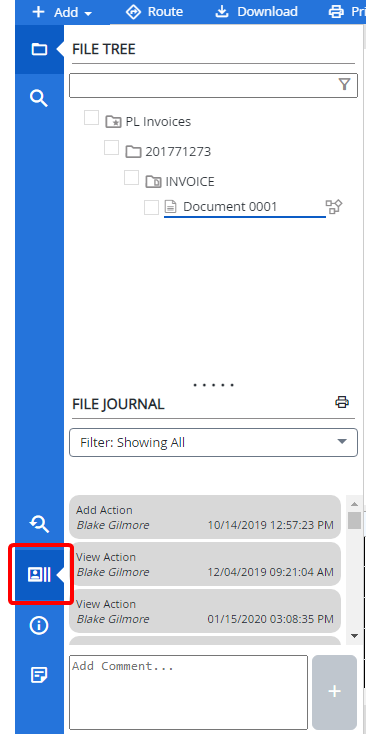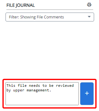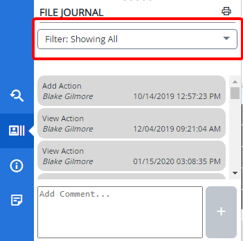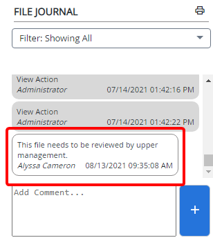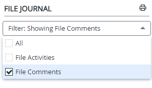 The File Journal allows you to see a combination of file activities and comments in a consolidated and simplified view. The entries in the File Journal are displayed in chronological order.