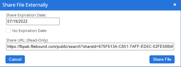 - In the Share File Externally dialog box select an expiration date for the shared file, or select the No Expiration Date check box.