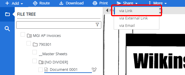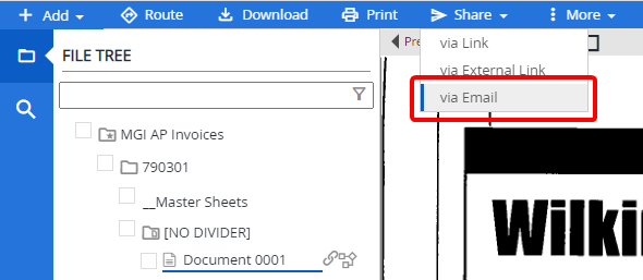 You can send documents to other users as attachments to an email message or via a link from within the Web Viewer. Documents can also be shared with non-FileBound users via an external link.