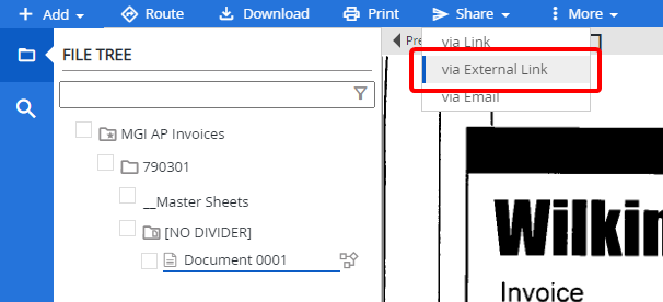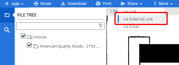 Share via External link allows users to share an entire file from the Web Viewer with non-FileBound users in a read-only format. When a file is shared, all documents within the file are shared.