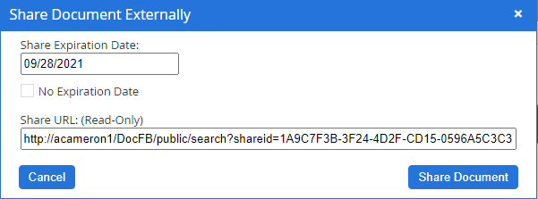 - In the Share Document Externally dialog box select an expiration date for the shared document, or select the No Expiration Date check box.