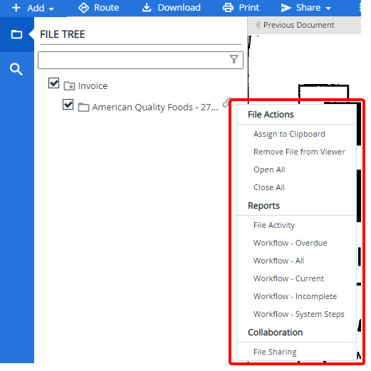 Once a file has been shared externally from the Web Viewer, a File Sharing option will be available in the Collaboration section of the File Actions menu. Using this option, you can modify expiration dates, delete external URLs, and view expired external URLs.