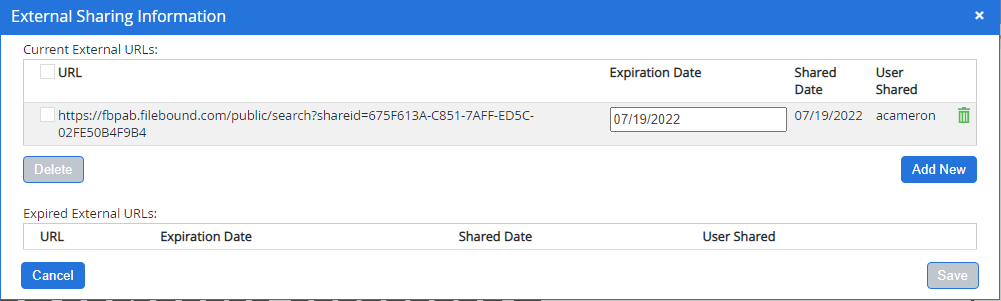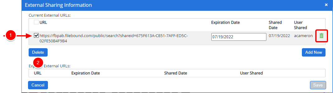 To delete an external URL, select the check box next to an external URL and click Delete or click Delete. Once deleted, the URL will be moved to the Expired External URLs section and will no longer be accessible externally.