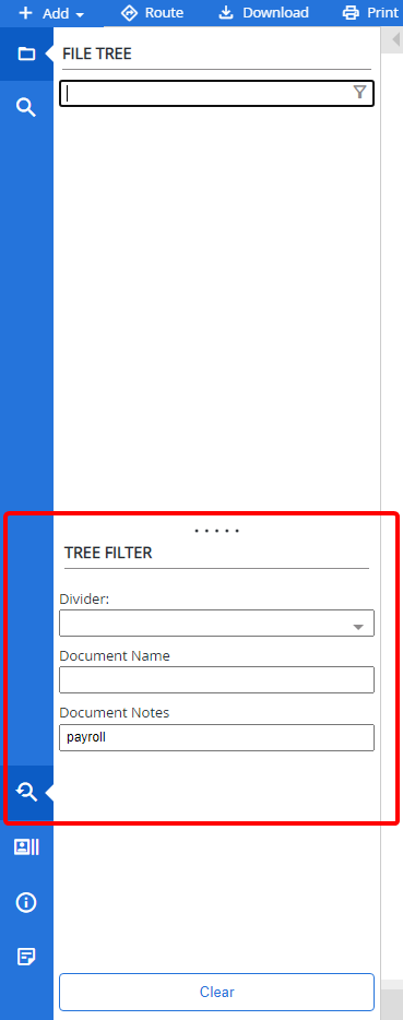 The Tree Filter functions similarly to the Global File Tree Filter, but with the Tree Filter, users can filter the File Tree more specifically by searching in document notes and full text information.
