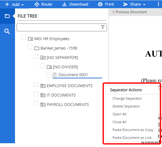 This option expands a separator to display all dividers and documents contained within that separator in the File Tree.