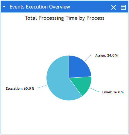 The Events Execution Overview widget provides information about the total processing time for each automation process. The information is displayed as a pie chart. Each section of the chart provides information about the processing time for the automation that the section represents.