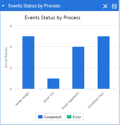 The Event Status by Process widget provides information about the automation processes that are processed. The information is displayed as a column chart. Each column displays the number of times the process has been processed successfully and the number of times it encountered an error.