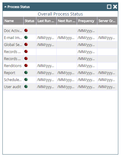The Process Status widget provides information about all available automation processes including the status of a process, its last run date, next run date, frequency, and the server group a process belongs to.
