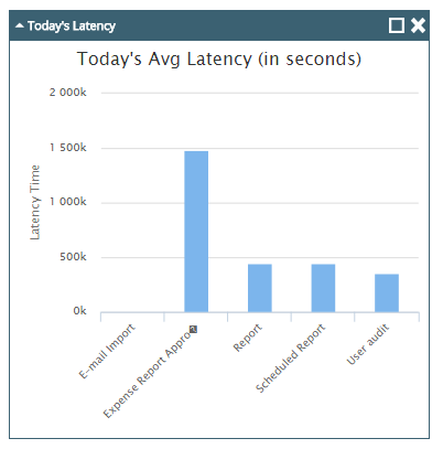 The Today's Latency widget provides information about the time interval between consecutive execution of an automation process. The information is displayed as a column chart. Each column of the chart provides information about the latency time for the automation process that the column represents.