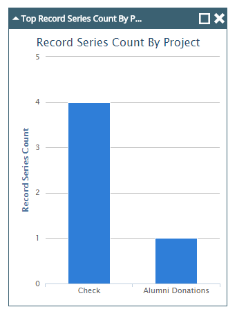 The Top Record Series Count By Project widget provides information about the top ten projects that have the largest number of record series. The information is displayed as a column chart. Each column of the chart displays the number of record series available in the project that the column represents. You can click on a column in the chart to view the information about the record series available in the project.