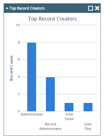 The Top Record Creators widget provides information about the top ten users that have declared the most records. The information is displayed as a column chart. Each column displays the number of records declared by the user that the column represents.