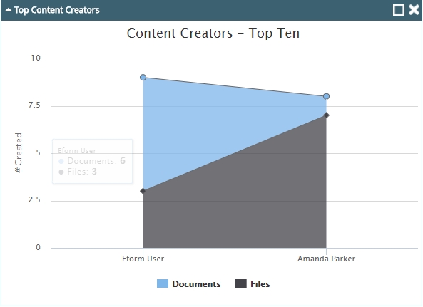 The Top Content Creators widget provides information about the top ten users that have created the most files and documents in FileBound. The information is displayed as a line chart. Each point on the chart displays the number of files and documents crated by the user that the point represents.