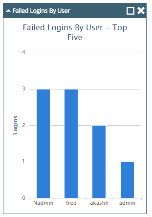 The Failed Logins By User widget provides information about the failed attempts by users to log in to FileBound. The information is displayed as a column chart. Each column of the chart displays the number of failed logon attempts by a user. You can click a column in the chart to view the information about the number of failed log in attempts by the user that the bar represents.