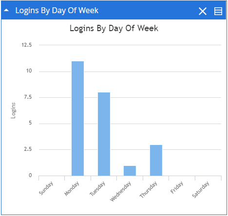 The Logins By Day Of Week widget provides information about the number of log ins on each day of the week. The information is displayed as a column chart. Each column of the chart displays the number of logins for that day. You can click a column in the chart to view the information about the users that logged in during the day that the bar represents.