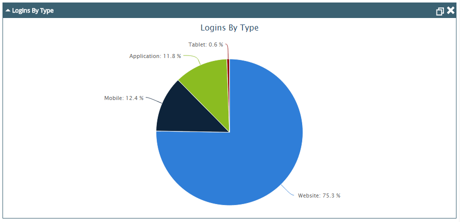 The Logins By Type widget provides information about the log ins from website, application, mobile, and tablet. The information is displayed as a pie chart. Each section of the chart represents a login type. You can move the mouse pointer over a section in the chart to display the number of log ins for the type that the section represents.