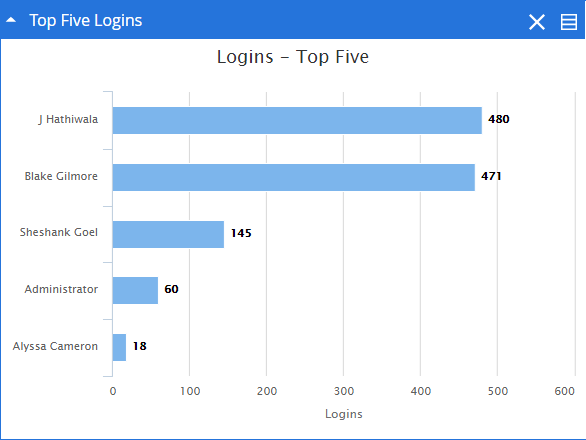 The Top Five Logins widget provides information about the top five users that have logged in to FileBound the most. The information is displayed as a bar chart. Each bar of the chart displays the number of times a user has logged in to FileBound. You can click a bar to view log in information of the user that the bar represents.