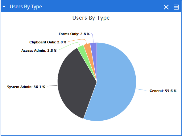 The Users By Type widget provides information about the number of users in each group in FileBound. The information is displayed as a pie chart. Each section of the chart displays the number of user in the group that section represents. You can click a section in the chart to display information about the users in the group that the section represents.