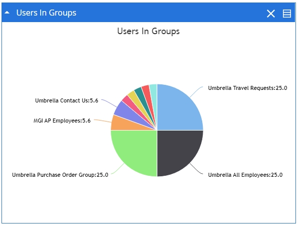 The Users In Groups widget provides information about the number of users in various groups within FileBound. The information is displayed as a pie chart. Each section of the chart displays the number of users in the group that the section represents. You can click a section in the chart to display information about the user in the group that the section represents.