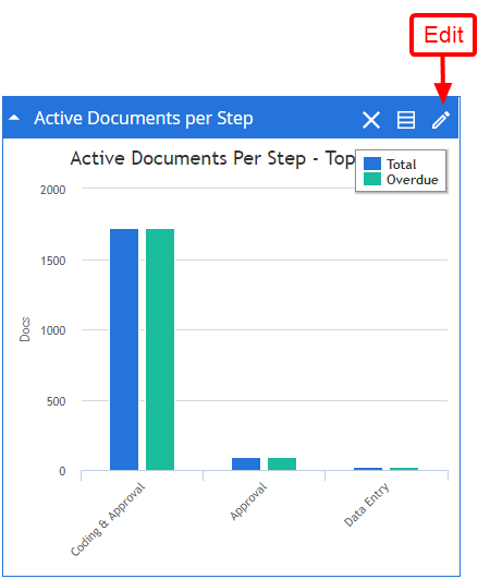 You can modify the title of the widget, the color of the title bar, the project, the workflow process, and how the list of documents is displayed by clicking Edit on the title bar.
