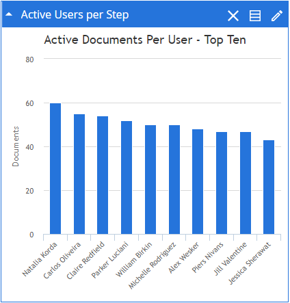 The Active Users Per Step widget provides information about the top ten users that are assigned to the most documents in a workflow. The information is displayed as a column chart. Each column of the chart displays the number of documents assigned to a user. You can click a column in the chart to display information about the documents assigned to the user that the bar represents.