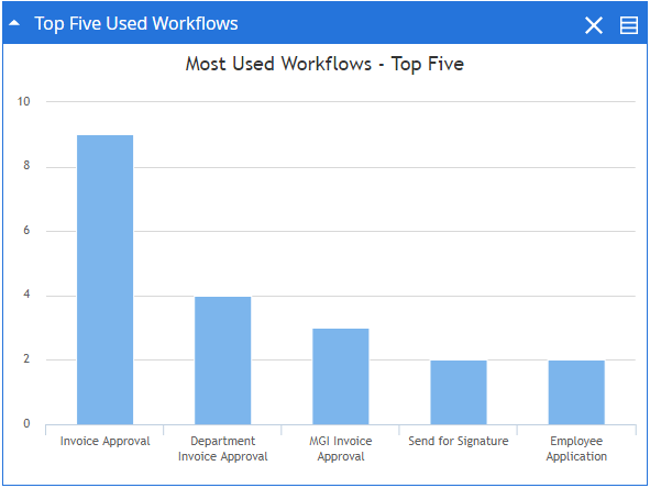 The Top Five Used Workflows widget provides information about the top five workflow processes that have the most documents. The information is displayed as a column chart. Each column on the chart displays the number of documents currently available in the workflow process that the column represents.