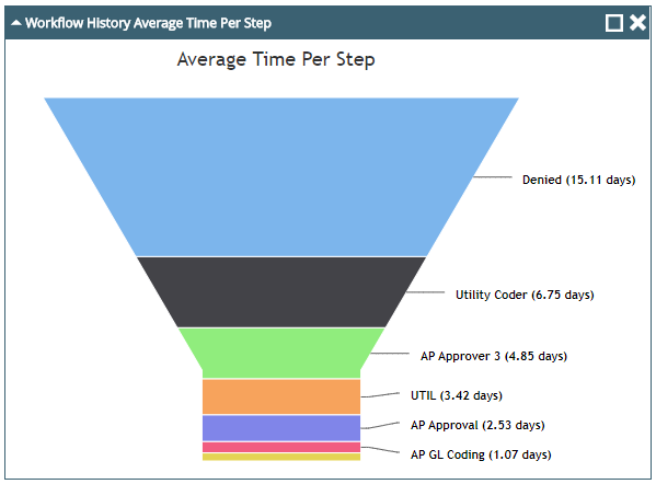 The Workflow History Average Time Per Step widget provides information about the average time to process documents in a workflow.