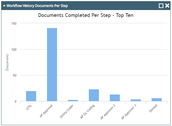 The Workflow History Documents Per Step widget provides information about the number of documents processed on each step of a workflow process. The information is displayed as a column chart. Each column of the chart displays the number of documents processed on a step that the column represents.