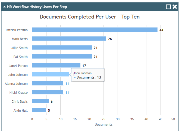 The Workflow History Users Per Step widget provides information about the top ten users that have processed the most documents in a workflow. The information is displayed as a bar chart. Each bar of the chart displays the number of documents processed by a user. You can click a bar in the chart to display information about the documents processed by the user that the bar represents.