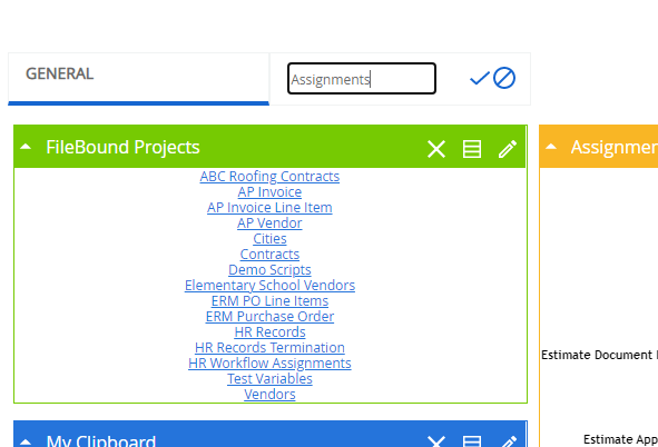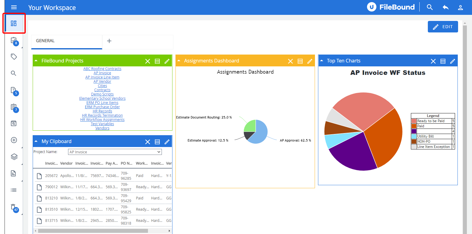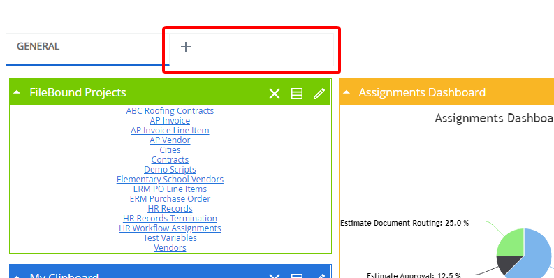FileBound provides a Workspace for faster access to projects, files, and documents via widgets. Widgets are sections within the Workspace that display information. You can set up your workspace according to your preferences and work duties. Reports and widgets can be viewed together and grouped based on functional area, project, document, activity - or any other combination that allows you to work more efficiently. See Widgets for more information.