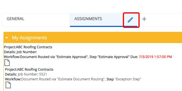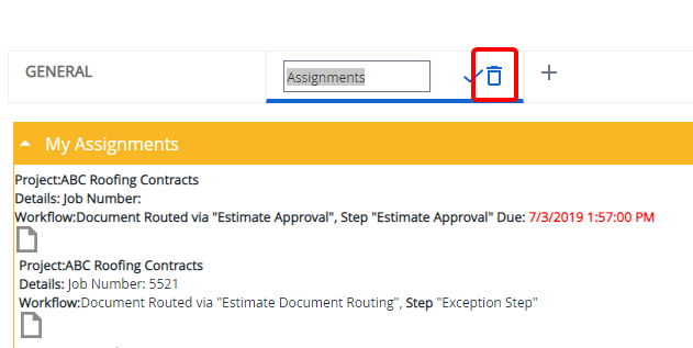 Widgets can be grouped together in the Workspace using tabs. The General tab is available in the Workspace by default, but you can add additional tabs in order to group widgets. For example, you can use the My Clipboard widget to display a list of documents added to the Clipboard for Project 1 on one tab and Project 2 on another tab.