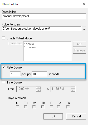 For example, you can specify a rate of 2 jobs per 10 seconds for a low-priority folder. This reserves processing resources for more important and high-priority folders. Rate control is optional. The Filescan connector processes jobs as fast as it can if Rate control is not selected.