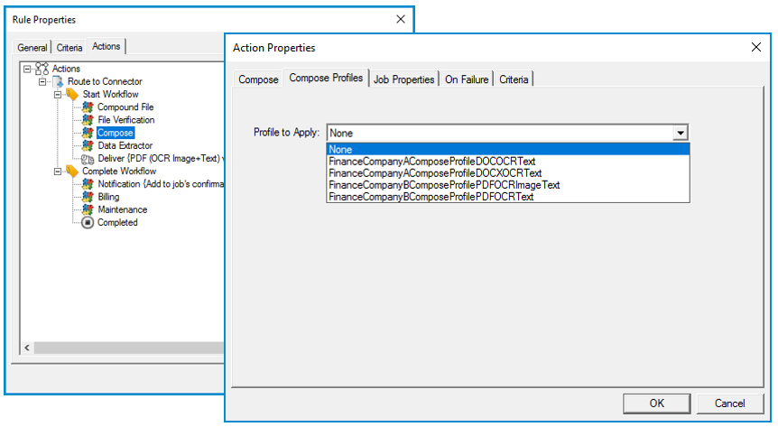 The Administrator sets the Compose Profiles to a job property by using Rule properties > Actions > Job Properties tab.