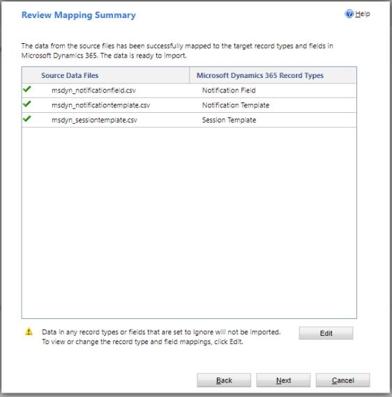 Note: If the Notification Template record type displays a warning, check to see if the "Show Timeout" and "Timeout (Seconds)" fields are unmapped. These can be set to "Ignore".