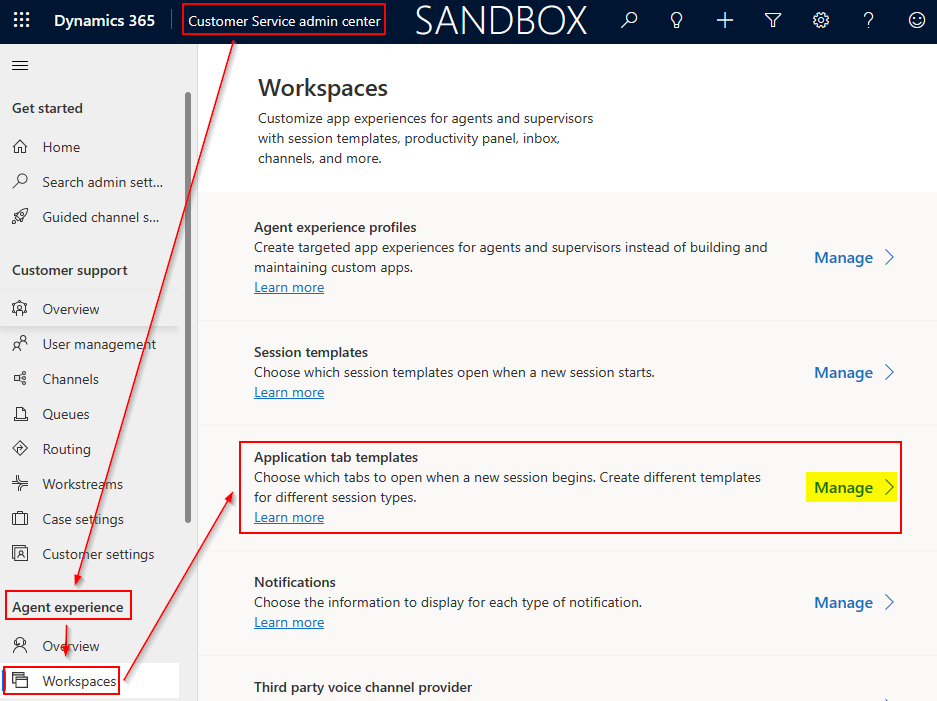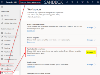 - In the Customer Service Admin Center, navigate to Agent Experience | Workspaces in the side menu, and then select Manage under the Application tab templates section.