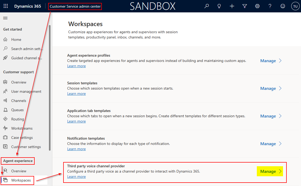 Navigate to Agent Experience | Workspaces from the side panel, and select the Manage under the Third party voice channel provider section.