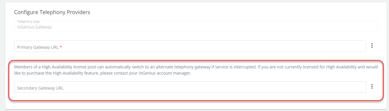 Note: To retrieve your secondary gateway URL from the InGenius Configuration Tool, follow the steps described in the Configure Telephony Gateway Profile section. Ensure to copy and paste the secondary gateway URL from the Configuration Tool into the Secondary Gateway URL field.